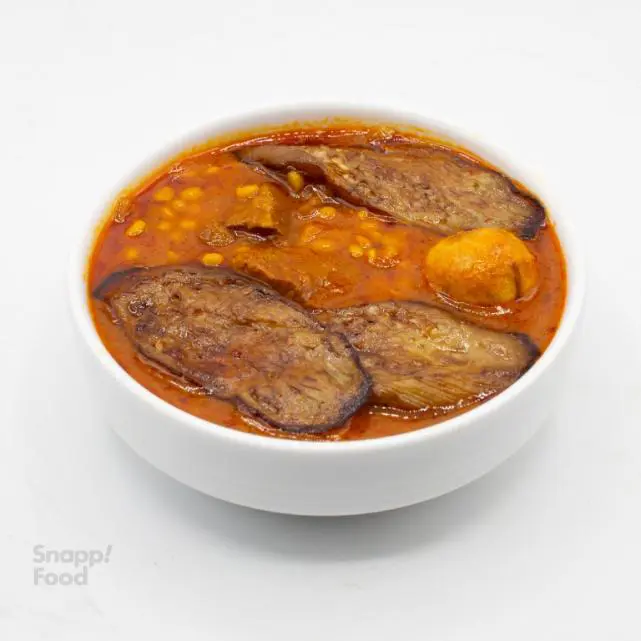 ۳۰۰ گرم خورشت ، ۷۰ گرم گوشت ران گوساله ، بادمجان سرخ شده ، بدون نان ، بدون برنج