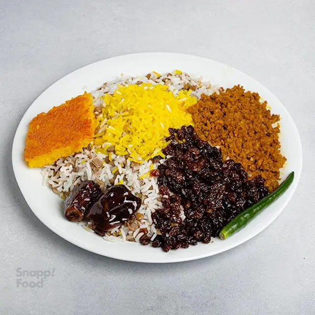 ۳۵۰ گرم برنج ایرانی، ۱۰۰گرم گوشت گوسفندی چرخ کرده، کشمش، پیاز داغ ته چین، خرما داخل ظرف ماکروفری