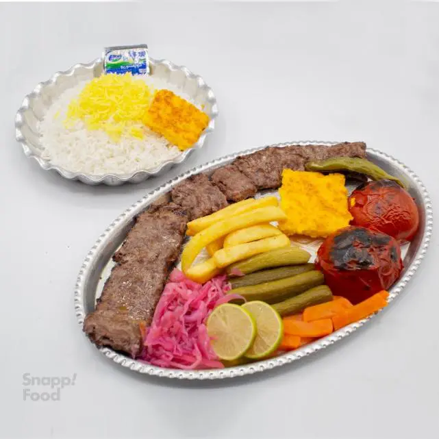 یک سیخ کباب برگ راسته گوسفندی ۱۸۰ گرمی ، ۳۵۰ گرم برنج ایرانی، گوجه و فلفل کبابی ، کره حیوانی ، دورچین : سیب زمینی سرخ کرده ، ترشی کلم ، هویچ پخته ، خیار شور