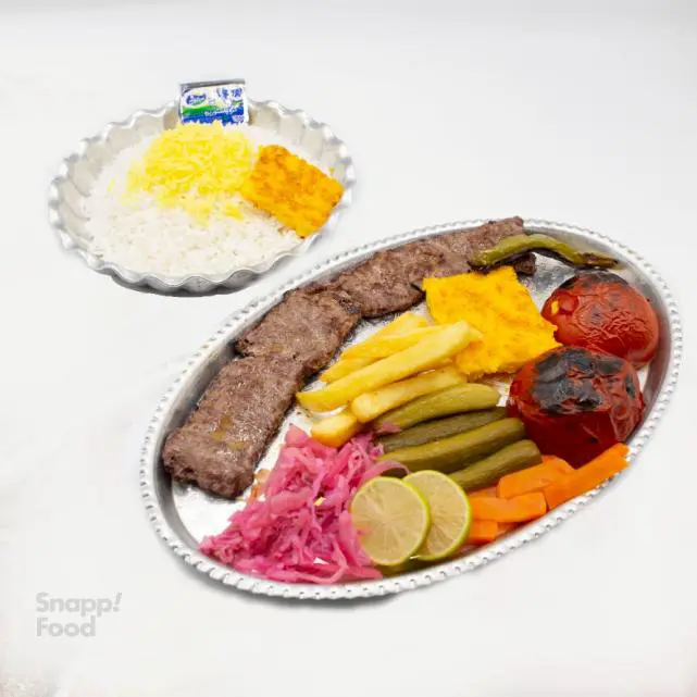 یک سیخ کباب برگ راسته گوسفندی ۱۴۰ گرمی ، ۳۵۰ گرم برنج ایرانی، گوجه و فلفل کبابی ، کره حیوانی ، دورچین : سیب زمینی سرخ کرده ، ترشی کلم ، هویچ پخته ، خیار شور
